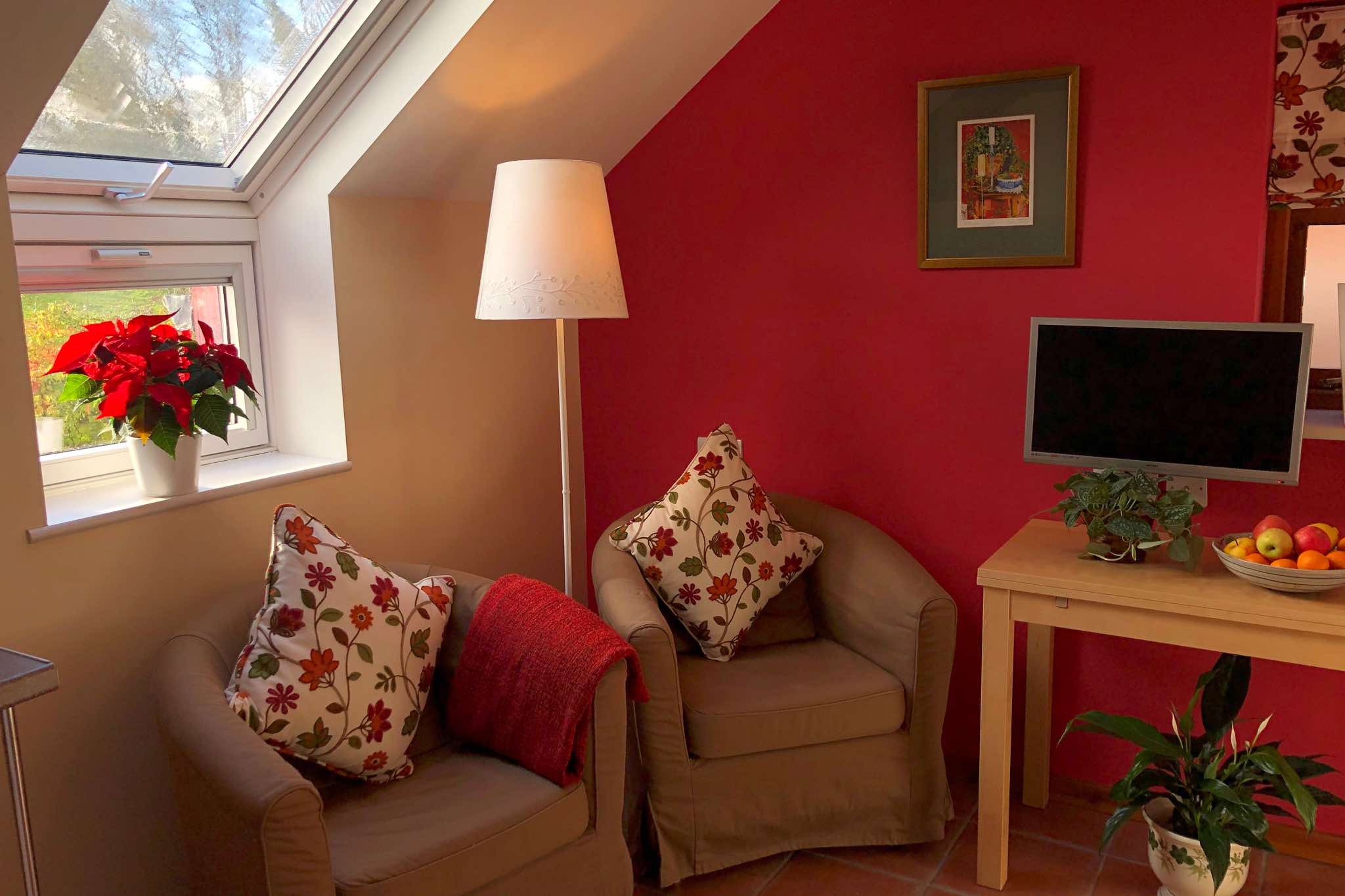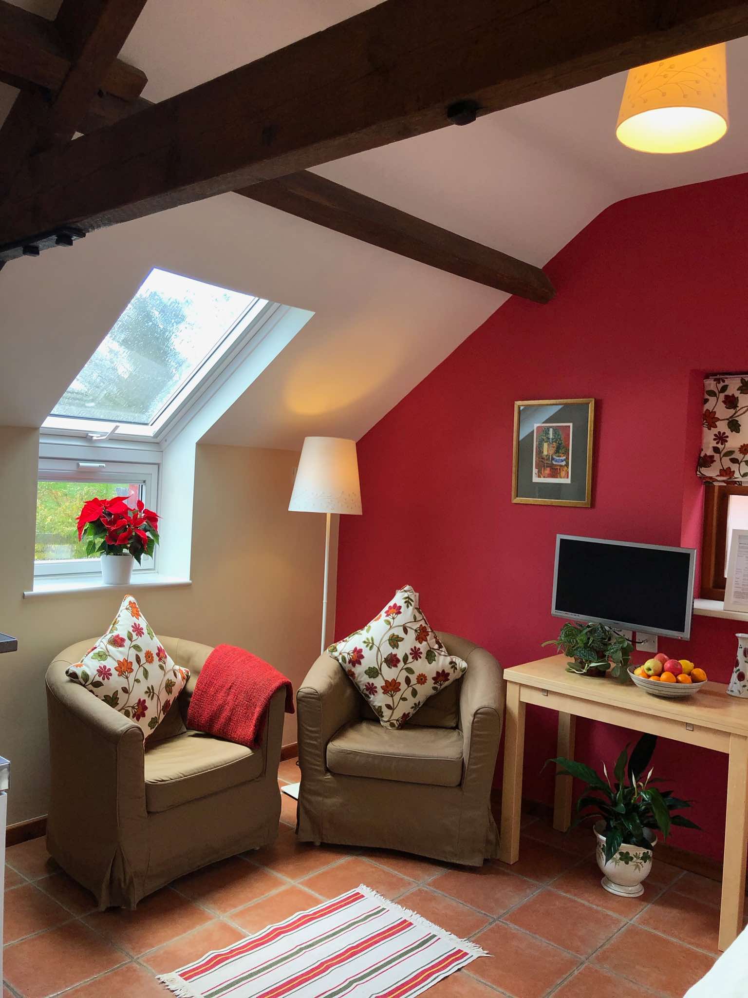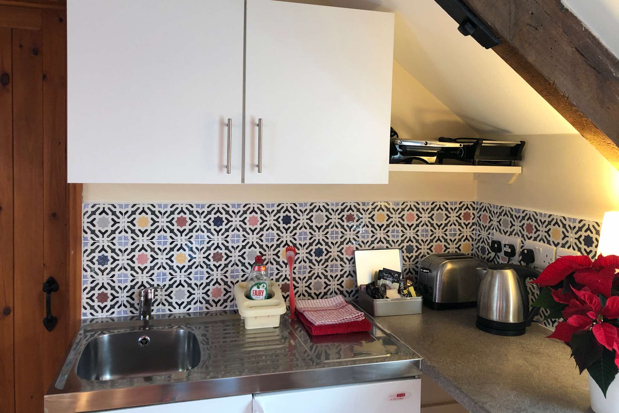 The Granary is a cosy first-floor, studio-style conversion, sleeping up to two people, and comes with exposed beams and an open-plan living area, with comfy tub chairs, TV / DVD, space to work, and a well-stocked mini-kitchen with single hob, fridge, microwave and toasted sandwich maker.